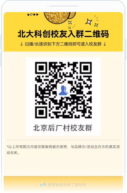 表单不仅仅可以用于信息收集,也可以用于信息展示使用。北大科创校友会使用麦客制作校友群在线海报,校友填写简单的个人信息并选择所在区域,提交表单后,页面会智能展示他所在的区域校友群二维码,扫描即可自动加群,一步实现信息收集与加群的双重功能。